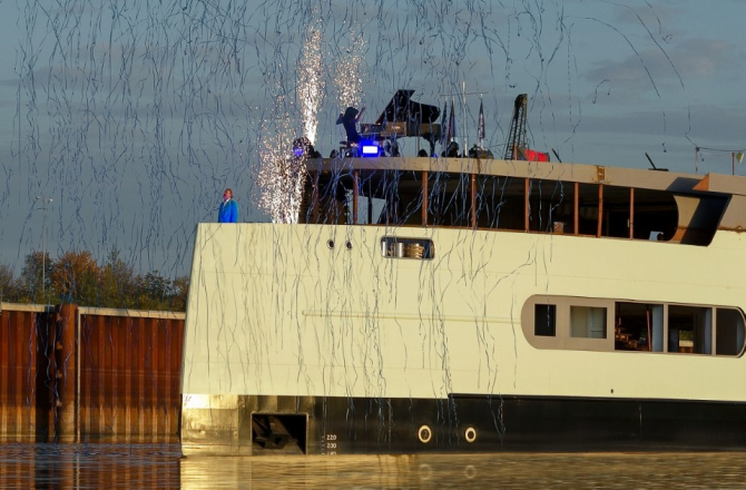 Eventminnend Nederland en belangrijke stakeholders kregen daarom een exclusieve preview. De genodigden werden op het zusterschip Grace Kelly ontvangen in Arnhem. Vanaf de Rijnkade vertrok het schip richting het casco van Blue Rhapsody. Aan boord genoten gasten van culinaire traktaties en muziek van de Slampampers. Extra bijzonder: aan boord van de Grace Kelly konden de aanwezigen als eerste 'een kijkje' aan boord van de Blue Rhapsody nemen: