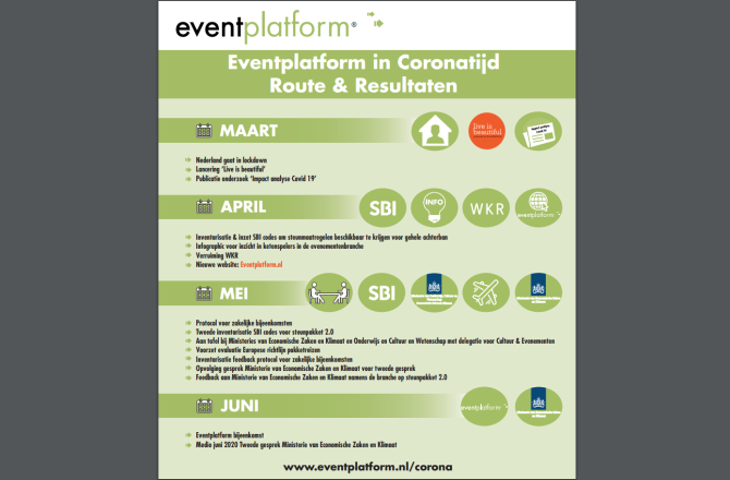 'In de massale zoektocht naar informatie en houvast (EventBranche.nl heeft inmiddels 50.000 unieke bezoekers per maand) hebben we tientallen mailtjes gekregen van eventbedrijven en ZZP-ers die zich niet gehoord voelden. Ook op LinkedIn zie je in veel groepen dat geluid. Aan onderstaande kun je zien dat het Eventplatform, waar verenigingen en organisaties natuurlijk namens hun leden inzitten, de doelen veel breder bepaalt dan dat. Voor de branche dus, voor de eventtroepen uit, en dat geeft een goed gevoel. Dus blijf doorgaan en blijf communiceren', aldus Sjoerd Weikamp (EventBranche.nl)