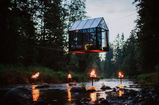 A new, never-before-found, levitating Mirror House above the river in Latvia was created, where during the day visitors participated in coffee rituals, but at night can enjoyed a night adventure: