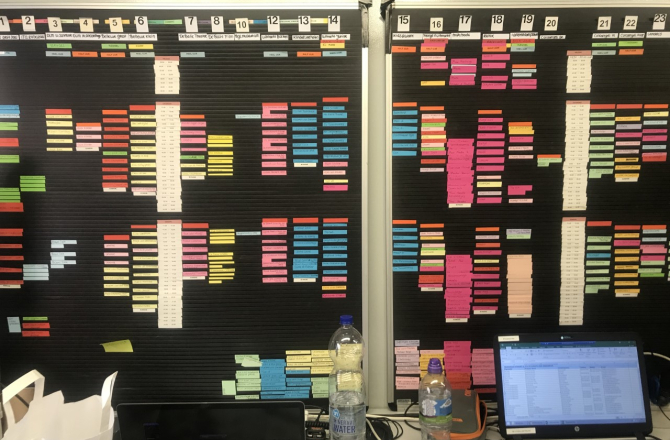 Ik heb er, net als vele anderen zin in. Ik weet dat er honderden collega’s zijn die zich momenteel klaarmaken voor hetgeen dat weldra komen gaat. Schoenen met stalen neuzen worden klaargezet en de werkmanspotloden worden geslepen. De eerste vergaderingen vonden al vorig jaar plaats, de eerste schema’s, planningen en begrotingen liggen op tafel of hangen zoals op bijgaande foto aan de wand van dit tijdelijke productiekantoor. De plek waar alles samenkomt, de plek waar ‘de centrale’ zijn onvolprezen verbindende werk doet. Het kloppende hart waar wordt gelachen, wordt geroepen en waar wordt gehuild. Waar mentale en fysieke pleisters worden geplakt en waar de ‘droppot’ sneller wordt leeg gegraaid dan dat ie door mensenhanden kan worden aangevuld.