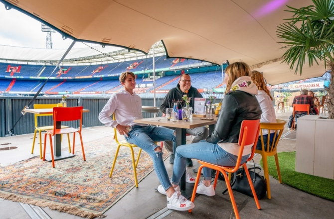 Voor evenementen maar ook voor overige geïnteresseerden is sinds 1 juli een Zomerterras geopend in De Kuip. Een iconische plek voor een terras. Via de unieke looproute via de spelerstunnel en langs het veld kom je op het terras. Bekijk hier alle mogelijkheden en reserveer een plek op het terras.