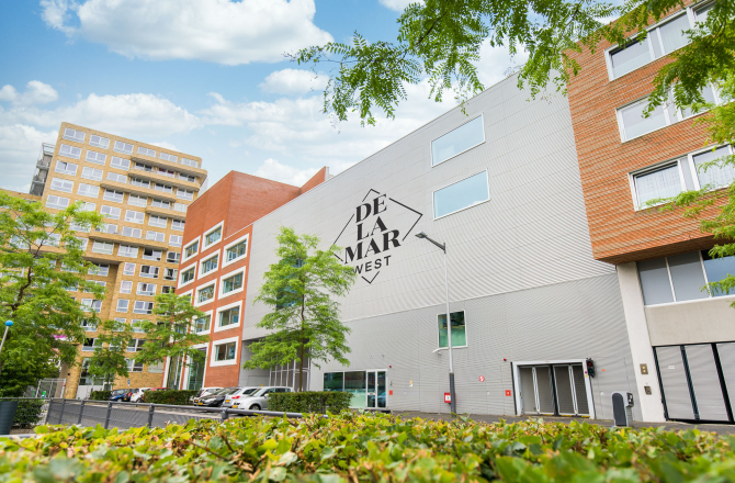 Waar DeLaMar Theater twee theaterzalen heeft voor respectievelijk 600 en 950 gasten, is DeLaMar West geschikt voor kleinschaliger evenementen voor maximaal 200 personen. Naast een vlakke vloer theaterzaal, met een flexibele tribune, biedt het gebouw ruimte aan repetitiestudio’s welke ook als subruimtes kunnen worden ingezet.