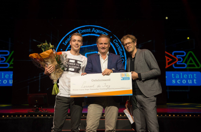 IDEA TALENT SCOUT - Tijdens de lustrumeditie van IDEA Talent Scout is Lennart de Jong studerend aan de Hogeschool Utrecht, verkozen tot event talent van het jaar. Als prijs gaat hij een traineeship, afstudeerstage of coachingstraject aan met een van de jurerende IDEA-bureaus. De Jong maakte indruk door in een t-shirt Power to the Audience te verkondigen en zijn mede-studenten hun talent op zijn shirt te laten plakken.