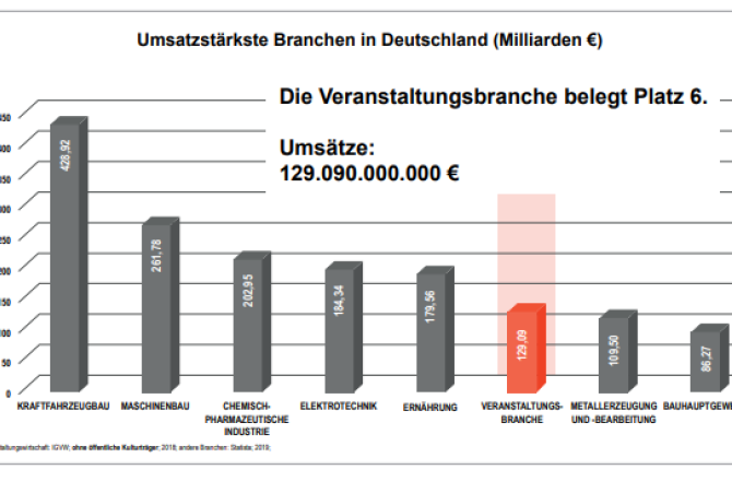 EVENEMENTEN ONDERZOEK - Zo, ga maar even goed zitten, want in Duitsland zijn ze eruit: de 'veranstaltungsbranche' staat op de zesde plek als het gaat om branches in Duitsland met de grootste omzet. Beurzen, congressen en evenementen zijn in Duitsland goed voor 129.090.000.000,- euro.