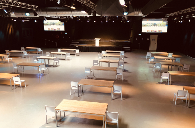 De lunch en de pauzes vonden plaats in het Horeca Plaza (861 m2) en op het terras. Hier pakten gasten zelf de koffie en thee, stonden frisdranken klaar en werd de lunch aangeboden in een lunch bag. Verse items, maar wel voorverpakt volgens de voorschriften. Tevens is een ‘Coronaverantwoordelijke’ aangewezen die er tijdens de bijeenkomst op toe zag dat de geldende richtlijnen werden nageleefd.