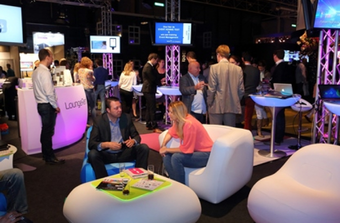 De complete aankleding inclusief de opvallende bar, designmeubels voor de innovatiepartners en de loungehoek met inflatable meubels gaven de gewenste uitstraling.