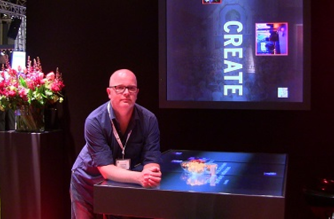 Danny Rats van Studio Rats komt 's middags even een kijkje nemen in de stand van AVR Bazelmans, waarvoor hij de productie heeft verzorgd. Danny is contentcreator. Tien jaar geleden bestond dat beroep nog niet eens, tegenwoordig zijn contentcreators onmisbare schakels tijdens large scale events. “Een content creator creëert beeld en sfeer tijdens een event,” vertelt Danny Rats. “Ik vertaal een boodschap in een communicatievorm en gebruik daarvoor video, animaties, graphics, 2D en 3D en touch interfaces.” Eventbedrijven, toeleveranciers en de top van de corporate markt (zoals onlangs BMW, Philips en Jaguar) doen steeds vaker een beroep op hem. “De specialisatie van Studio Rats is om met meerdere schermen tegelijk te communiceren. Vroeger was de trend groot-groter-grootst, maar tegenwoordig gaat om het om interface: de interactie tussen spreker en toehoorders. De technologische ontwikkelingen volgen elkaar snel op, en de nieuwe technieken worden steeds complexer. Via internationale fora blijf ik op de hoogte van de nieuwste trends en ontwikkelingen.” En, nog nieuwe technologieën gezien op Event14? Danny Rats: “Nee, daarvoor ga ik naar technologiebeurzen. De beurs Event14 bezoek ik vooral voor relatie onderhoud.”