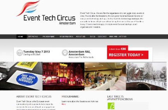 William Thomson, van organisator Gallus Events uit Engeland, geeft tekst en uitleg: 'Taking place on the 7th May - but with attendees spending a full day before and a full day after the physical event to support their chosen event tech start-up - Event Tech Circus has a challenging and disruptive format. With such a daring and innovative concept Gallus Events chose vibrant Amsterdam and the already well developed micro system as the natural City to hold and support Event Tech Circus. And the Netherlands event community have been quick to support the Circus. Event Tech Circus will bring together organisers, start-ups and investors in the European event technology space. The event has been structured to make the right conversations happen and to bring together the three sections of the event tech community to encourage on-going relationships.'
