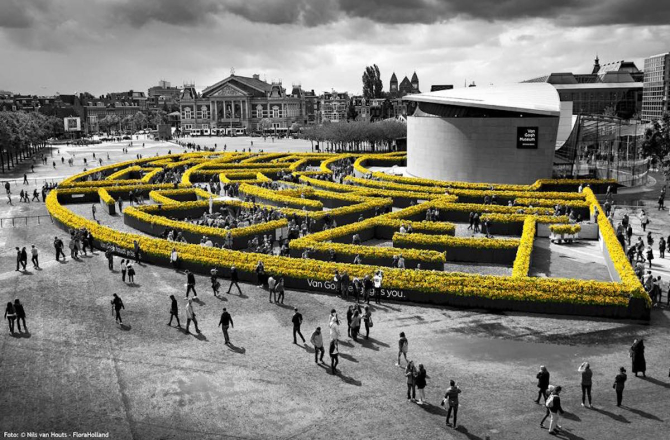 Bureau XSAGA: 'In opdracht van het Van Gogh Museum bedachten en produceerden wij het zonnebloemen labyrint op het Museumplein in Amsterdam met 125.000 zonnebloemen. Aanleiding van deze actie was de opening van het nieuwe entreegebouw van het museum.'