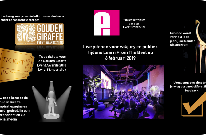 10. Alle inzenders van een Gouden Giraffe case ontvangen voor de volgende editie een speciale korting. Winnaars krijgen de gelegenheid om hun case uitgebreid toe te lichten tijdens de netwerkevenementen van EventBranche.nl. Hierbij wordt dieper ingegaan op de strategische keuzes, het gekozen concept, de uitdagingen en uitvoering van het event.