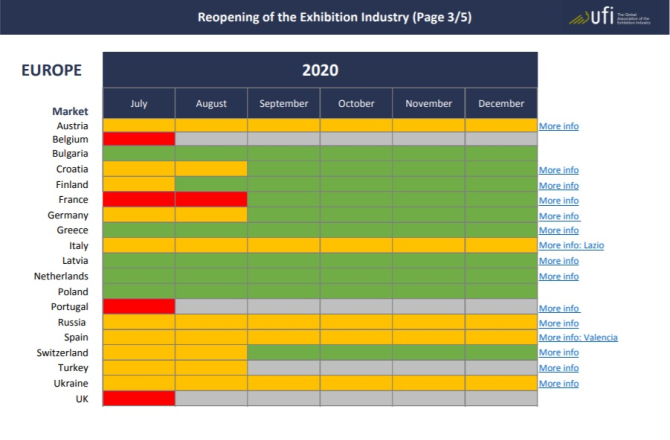 EVENEMENTEN EN CORONA - UFI, de wereldwijde vereniging van 's werelds toonaangevende beursorganisatoren bracht de heropening van tentoonstelingen en B2B events wereldwijd in kaart. Wanneer verwachten zij dat events weer kunnen plaatsvinden in Europa, rekeninghoudend met de geldende richtlijnen? Opvallend? Groen licht voor de Europese evenementenbranche in september.