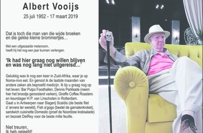 Vooijs was als reisgoeroe ook de ontdekker van veel jong talent en had een oog voor jonge mensen met kwaliteit. Zo zette hij als een der eersten Carel Kraayenhof in en een piepjonge onontdekte Andre Rieu. Zo flamboyant als zijn voorkomen, zo bijzonder zijn afscheidsboodschap. Diverse media pakten zijn overlijdensbericht al op. Vooijs deelt zijn tips voor lekker eten en sluit af met 'Niet treuren, ik heb geleefd!'