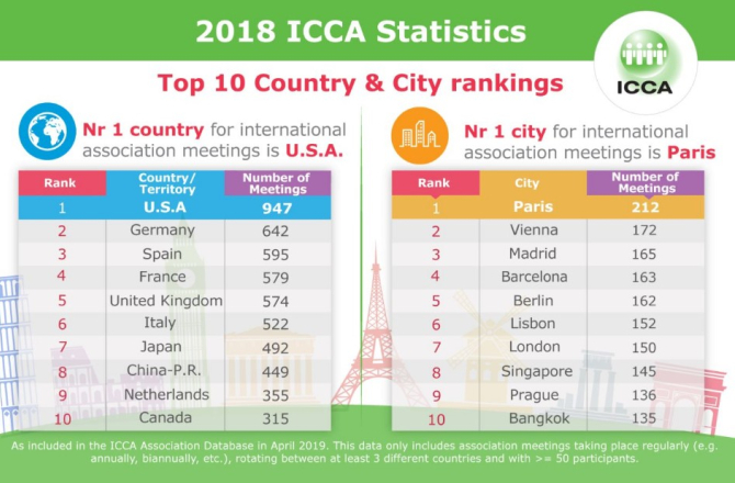 ICCA, International Congress and Convention Association, maakt jaarlijks een ranglijst aan de hand van zogeheten: 'rotating association meetings', die op regelmatige basis georganiseerd worden met meer dan 50 deelnemers.