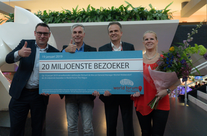 Op zaterdag 19 januari 2019 heeft World Forum The Hague de 20 miljoenste bezoeker van de congreslocatie verwelkomd. Na afloop van de show ‘Nights on Broadway – A Tribute to the Bee Gees’ werd Herre Roelevink uit Pijnacker (57) ten overstaan van een uitverkochte zaal in het zonnetje gezet door Wethouder Richard de Mos en General Manager Michiel Middendorf.